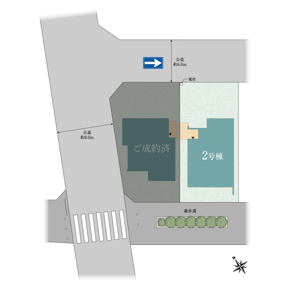 南側は遊歩道、北側は道路に面した立地です。遊歩道は公園やバス停、さらに通学路としても活用される安全・安全な道です。