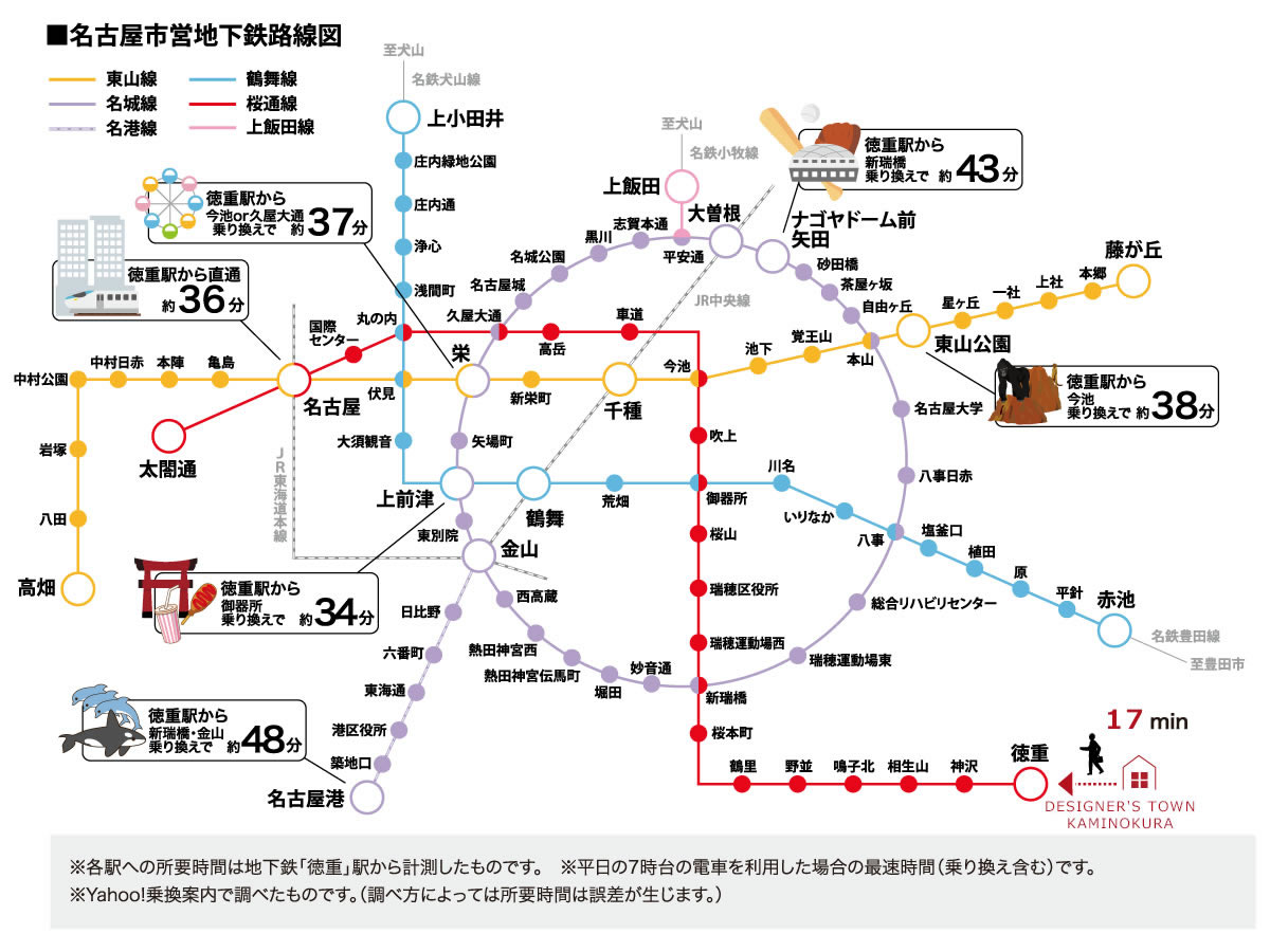 「徳重」駅から「名古屋」駅まで乗り換えなしで約36分、「久屋大通」駅まで約31分と、市内主要部へ快適なフットワーク。